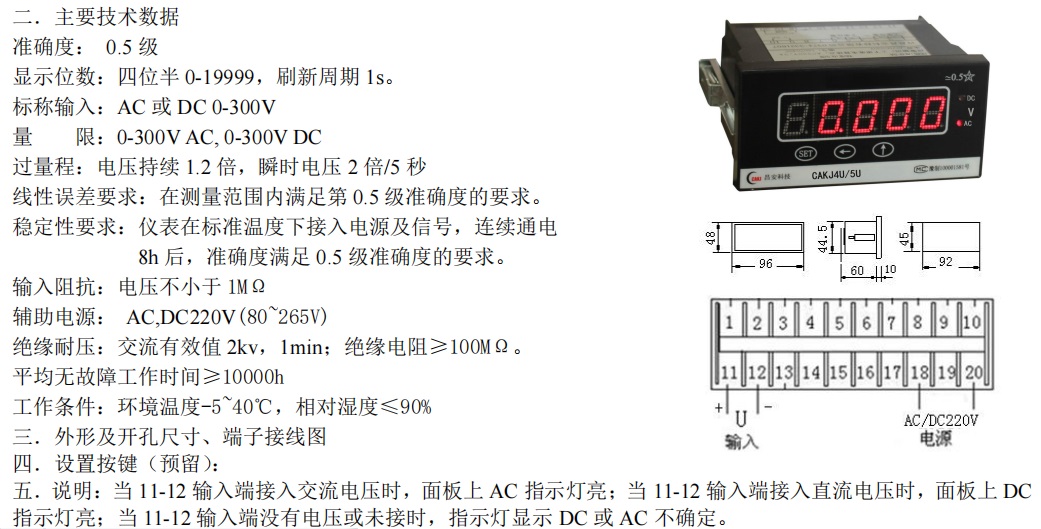 CAKJ494U/5U交直流電壓表適用于交直流系統(tǒng)電壓測量顯示。儀表采用高速AD轉(zhuǎn)換器及微處理器,對測量交直流電壓高速采樣,自動識別測量電壓為交流或直流,并帶有相應(yīng)LED指示。