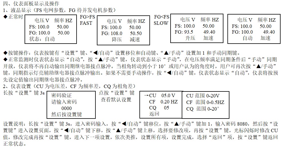 ◆ 同期完成0°指示燈常亮,儀表可長期處于電壓頻率監(jiān)測狀態(tài)。