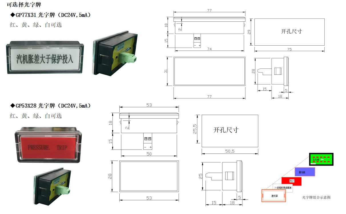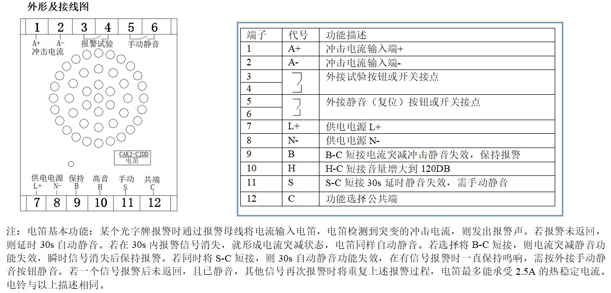 電流沖擊式電笛、電鈴,采集光字牌公共母線(公共端)或事故母線SYM、預(yù)告母線YBM的沖擊電流信號,驅(qū)動電笛、電鈴發(fā)聲。沖擊電流5mA-100mA,熱穩(wěn)定電流2.5A,以10mA電流為例,可同時在線250個報警光字牌。具備沖擊報警、沖擊靜音、30s延時自動靜音、手動靜音等功能,為組合光字牌的聲光報警提供了可選擇的聲音報警設(shè)備。
